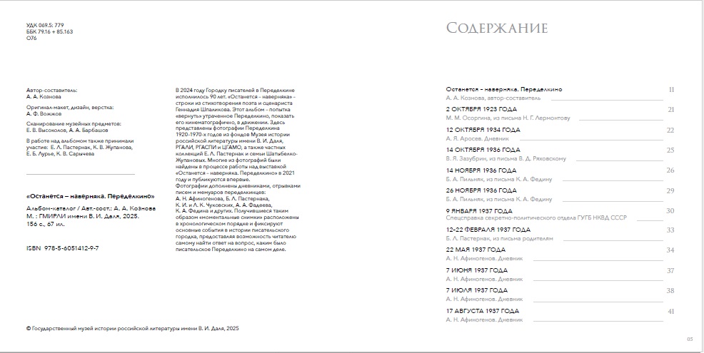 коллекций Е. Л. Пастернак и семьи Шатыбелко-Жупановых. Многие из фотографий были найдены в процессе работы над выставкой «Останется – наверняка. Переделкино» в 2021 году и публикуются впервые. Фотографии дополнены дневниками, отрывками писем и мемуаров переделкинцев: А. Н. Афиногенова, Б. Л. Пастернака, К. И. и Л. К. Чуковских, А. А. Фадеева, К. А. Федина и других. Получившиеся таким образом «моментальные снимки» расположены в хронологическом порядке и фиксируют основные события в истории писательского городка, предоставляя возможность читателю самому найти ответ на вопрос, каким было писательское Переделкино на самом деле.
